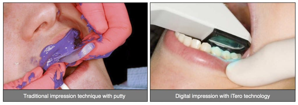Bệnh nhân được quét trong miệng (ảnh bên phải) thay cho lấy dấu truyền thống (ảnh bên trái)- Bước 4: Đeo khay niềng răng