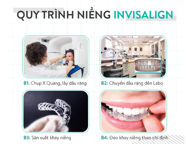 - Mỗi quá trình niềng răng trong suốt bao gồm một loạt 30 đến 50 khay nhựa trong suốt giống được cá nhân hoá theo tình trạng răng của bệnh nhân. Các khay nhựa có thể tháo rời và mỗi khay đeo trong khoảng 10-14 ngày.